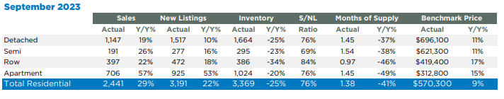 Sales of detached homes in September 2023 reached 572, a 7.5 per cent increase from the 532 detached sales recorded in September 2022. The benchmark price for a detached home is $2,017,100. This represents a 5.8 per cent increase from September 2022 and a 0.1 per cent decrease compared to August 2023.